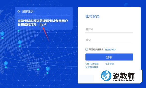 各自学考试学习服务中心、社会考生: 因受疫情影响,经研究决定由我校主考的高等教育自学考试6个本科和2个专科专业,其相关的实践课程考试环节采取线上考核方式进行,现将安徽财经大学2022年高等教育自学考试实践环节课程考试安排的具体时间、考试规程通知如下,希望各位老师、各位同学仔细查阅相关内容,安排好时间,准时参加考试。参考学生名单见(附件)。 1.考前准备 (1)考生需要自备一台电脑(电脑品牌型号不限),浏览器要求:chrome,或firefox,考试地点由学生自己选择,考生要选择一个安静独立的考试场所,必须保证学生本人独立完成考试。 (2)建议各助学中心尽量组织学生统一到教室(机房)完成考试。 2.考试流程 (1)考生登录 http://jjyxt.aufe.edu.cn网址后,通过账号密码进入考试平台(账号密码均为jjyxt),如下图所示: